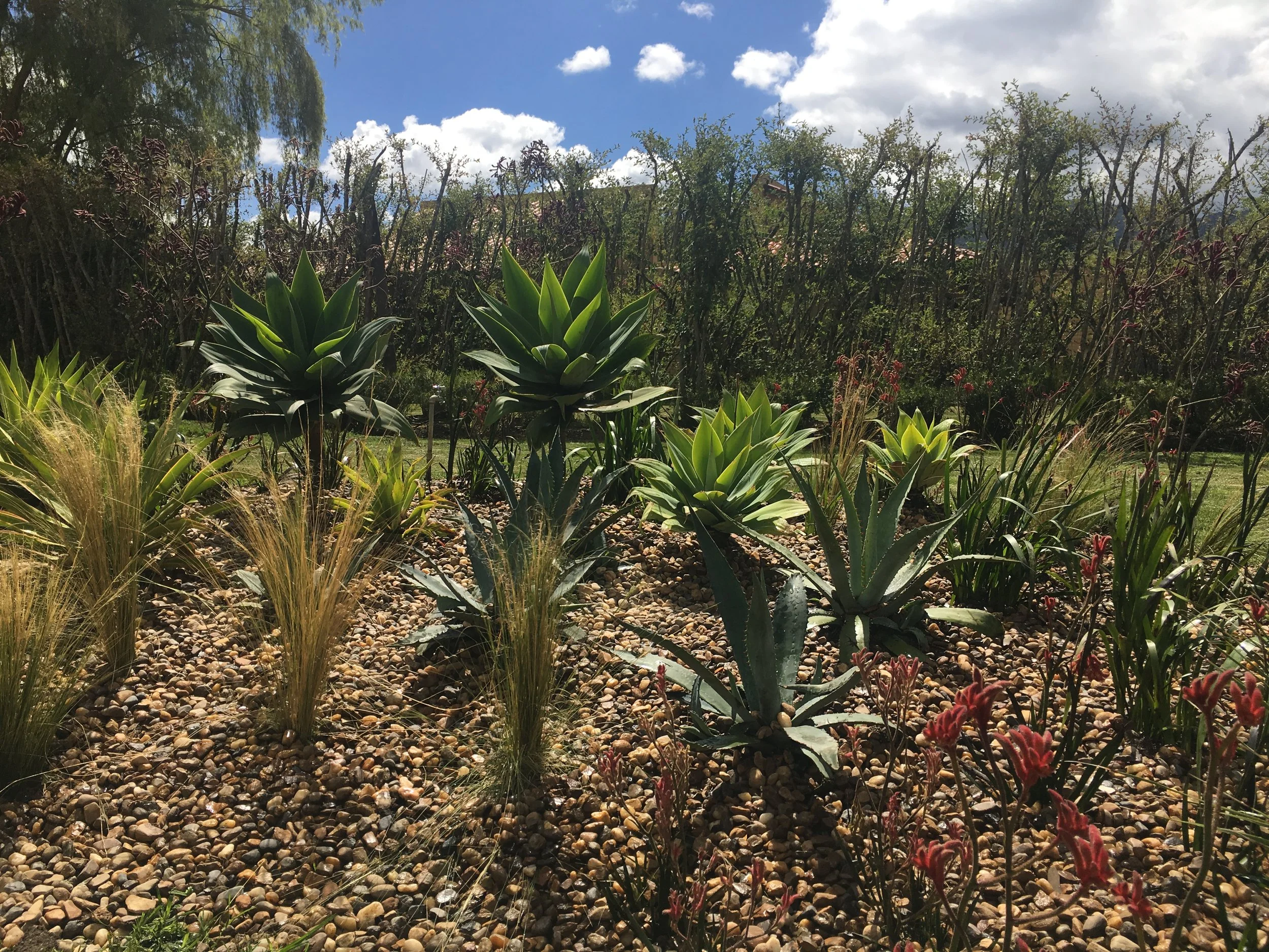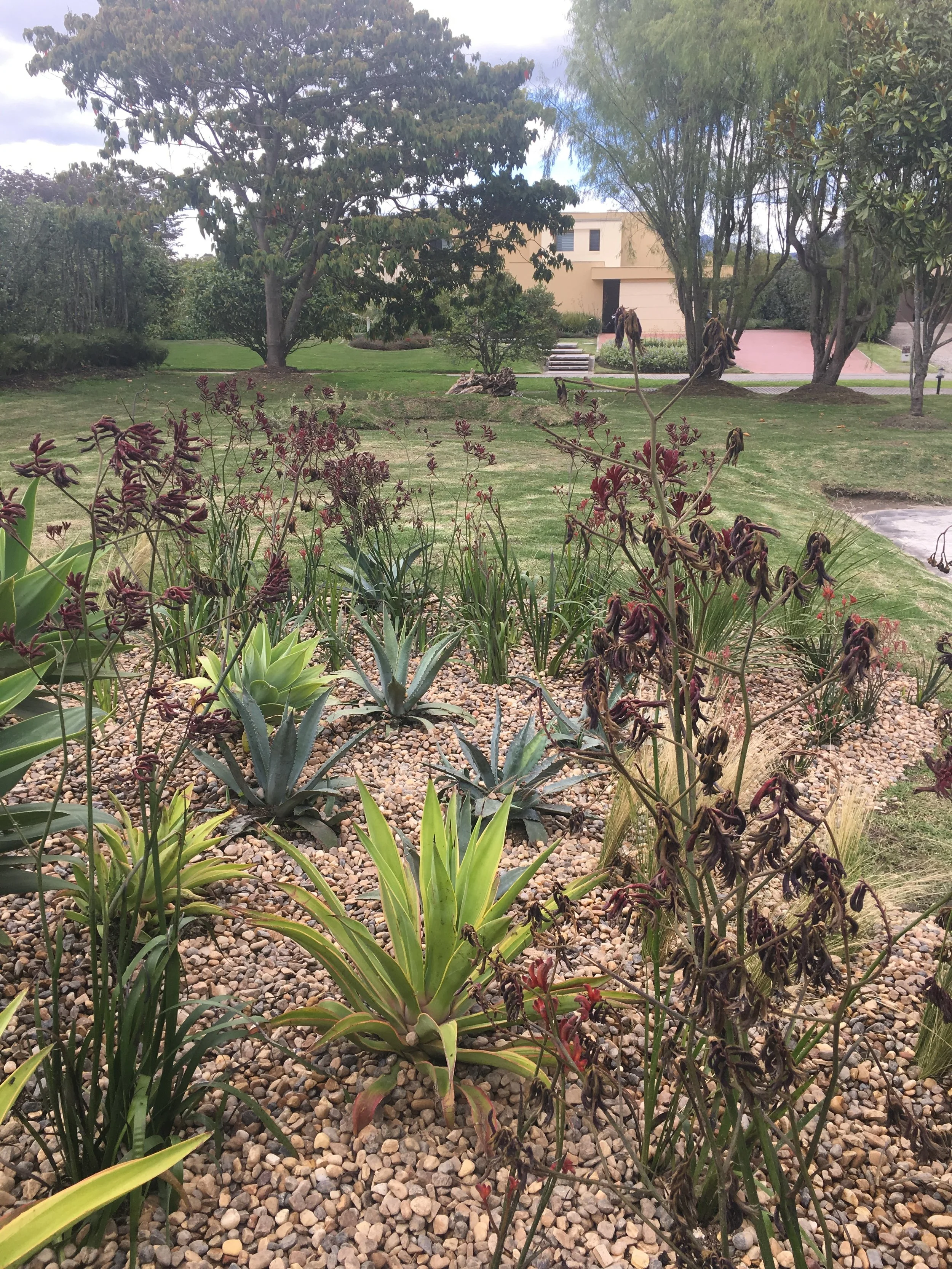 Características: Proyecto diseñado pensando en el consumo mínimo de agua y de labores de mantenimiento. Casi todas las especies utilizadas tienen la capacidad de retener agua en diferentes partes de su estructura: hojas y tallos. Son resistentes a las sequías y perfectas para hacer jardines sostenibles.