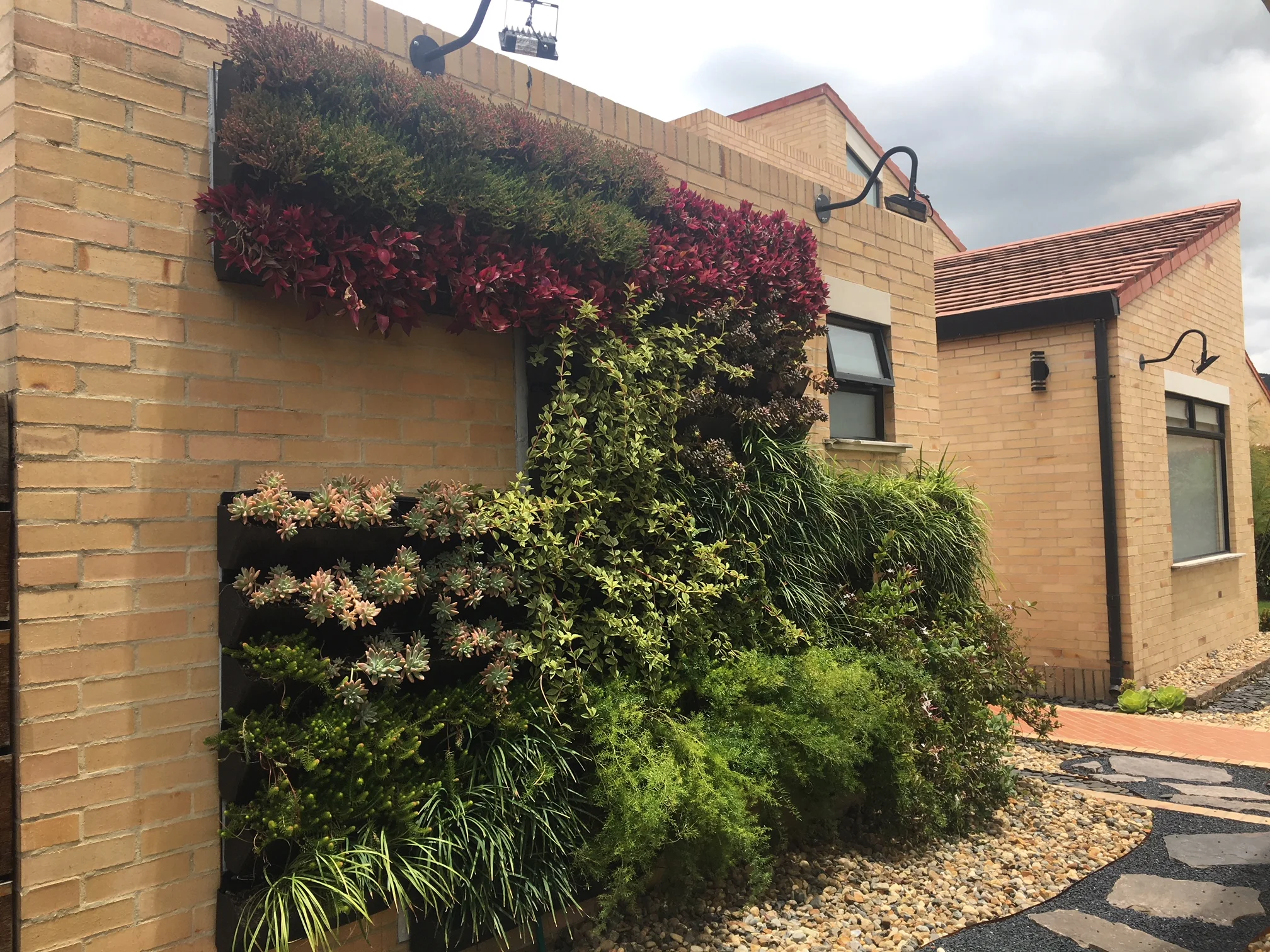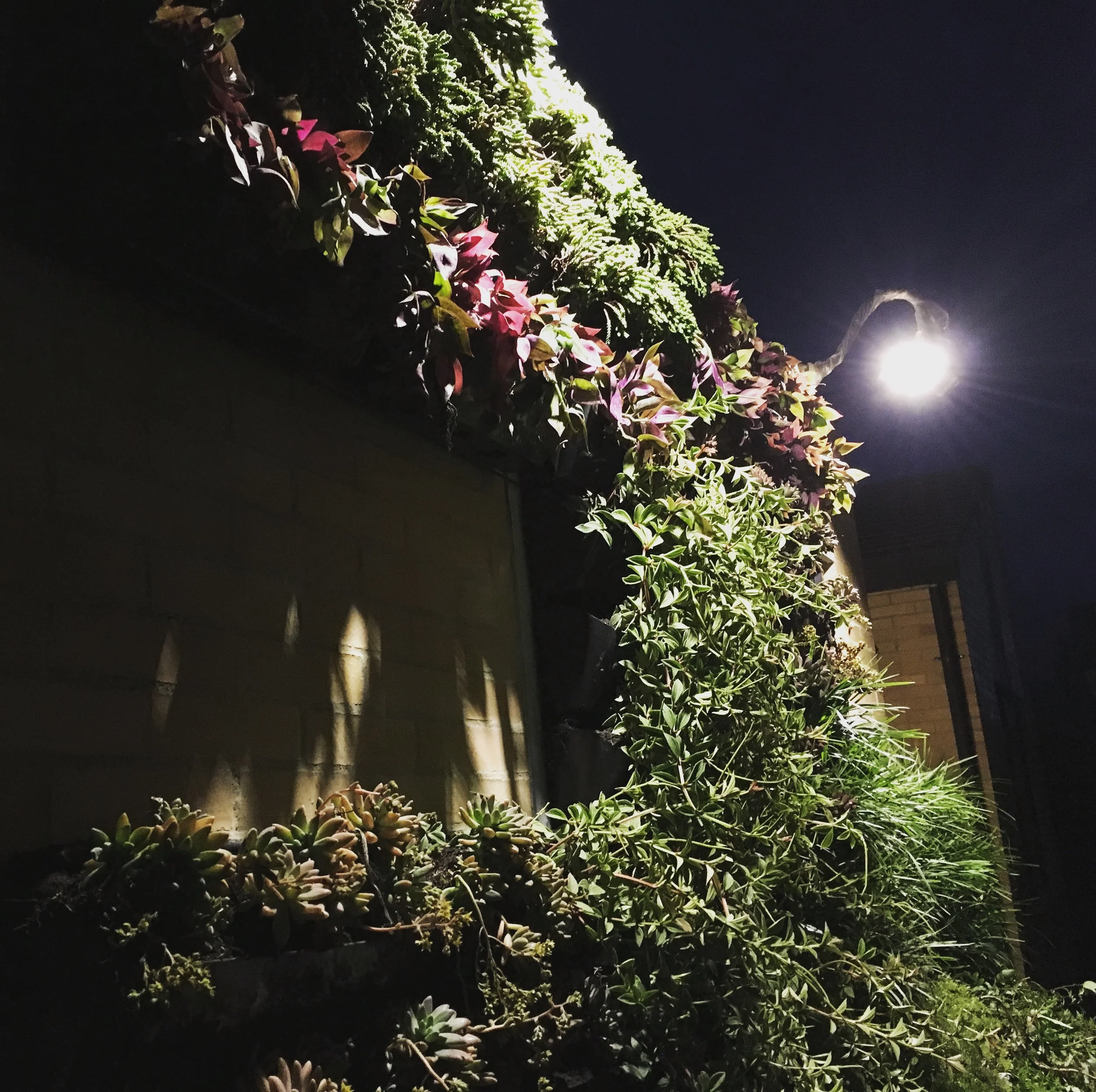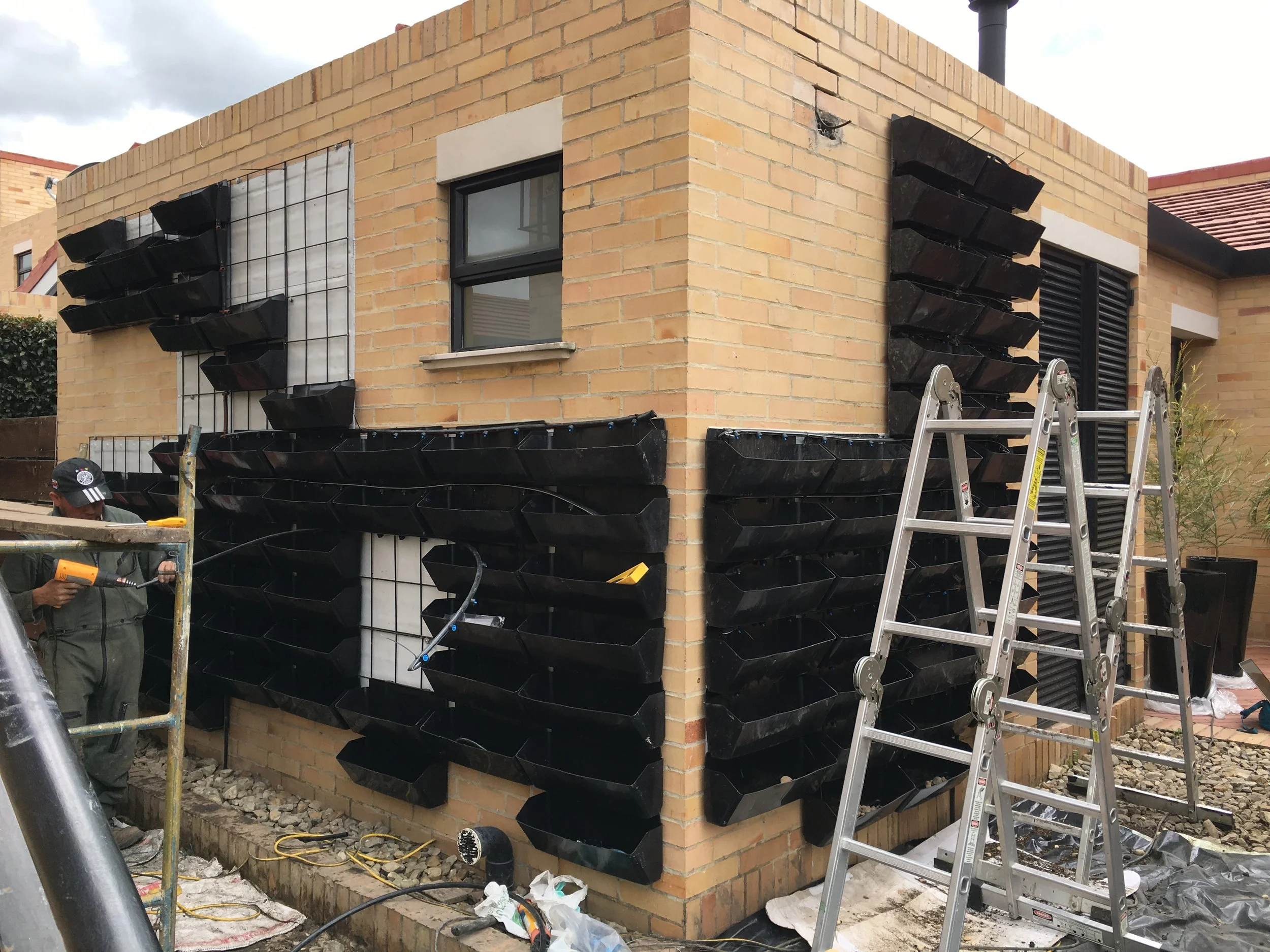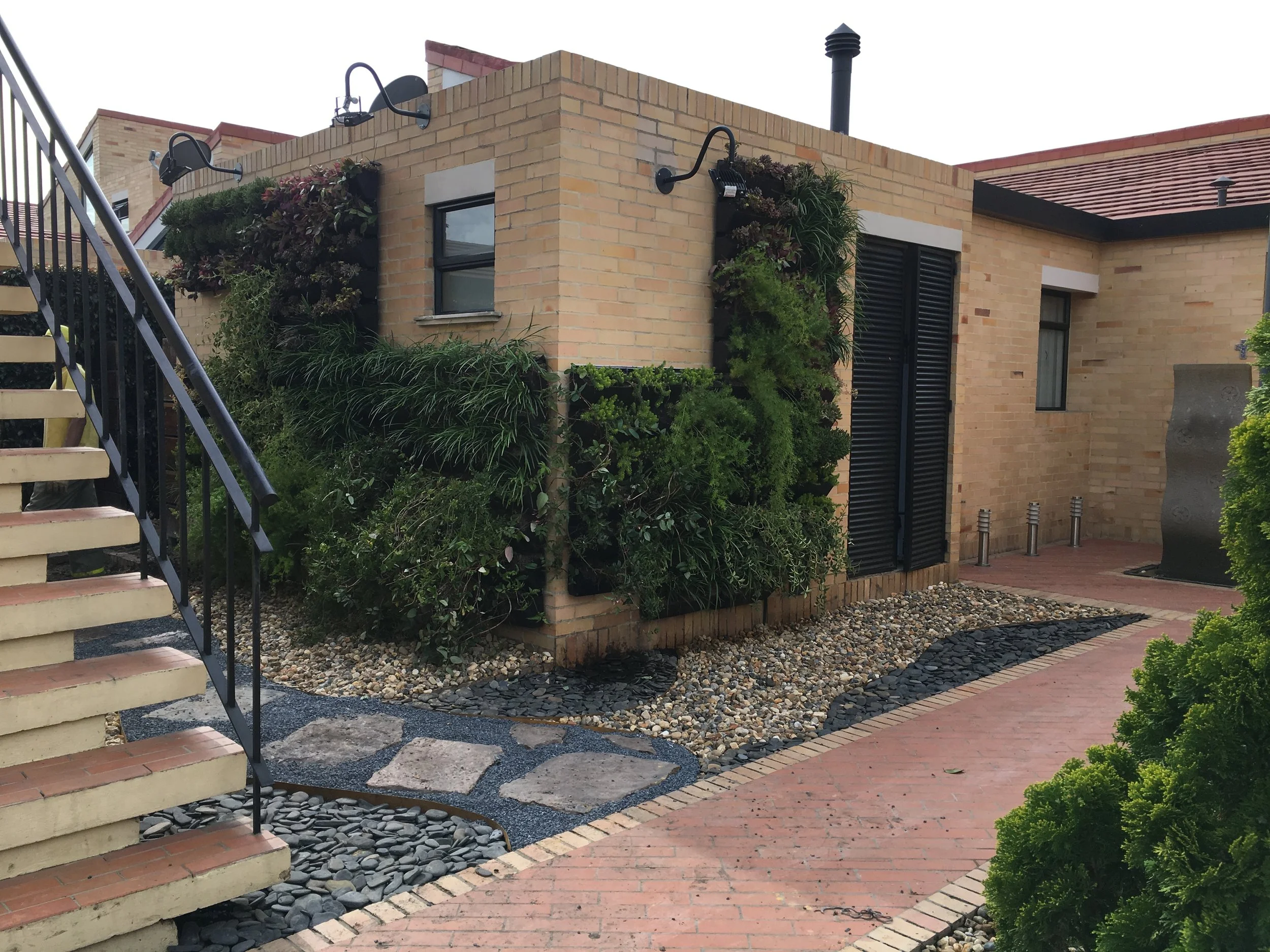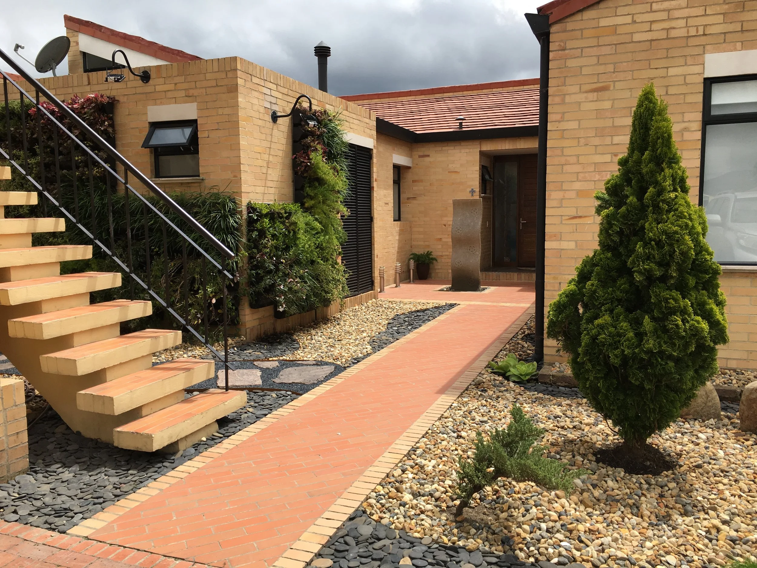Características: Para este proyecto se propuso despejar la entrada a la casa utilizando un jardín vertical con formas ortogonales asimétricas. Parte del material vegetal utilizado, produce aromas agradables al pasar, despertando los sentidos y dándole la bienvenida a los que llegan. El jardín vertical cuenta con un sistema de riego por goteo, automatizado e impermeabilización con membrana de PVC.