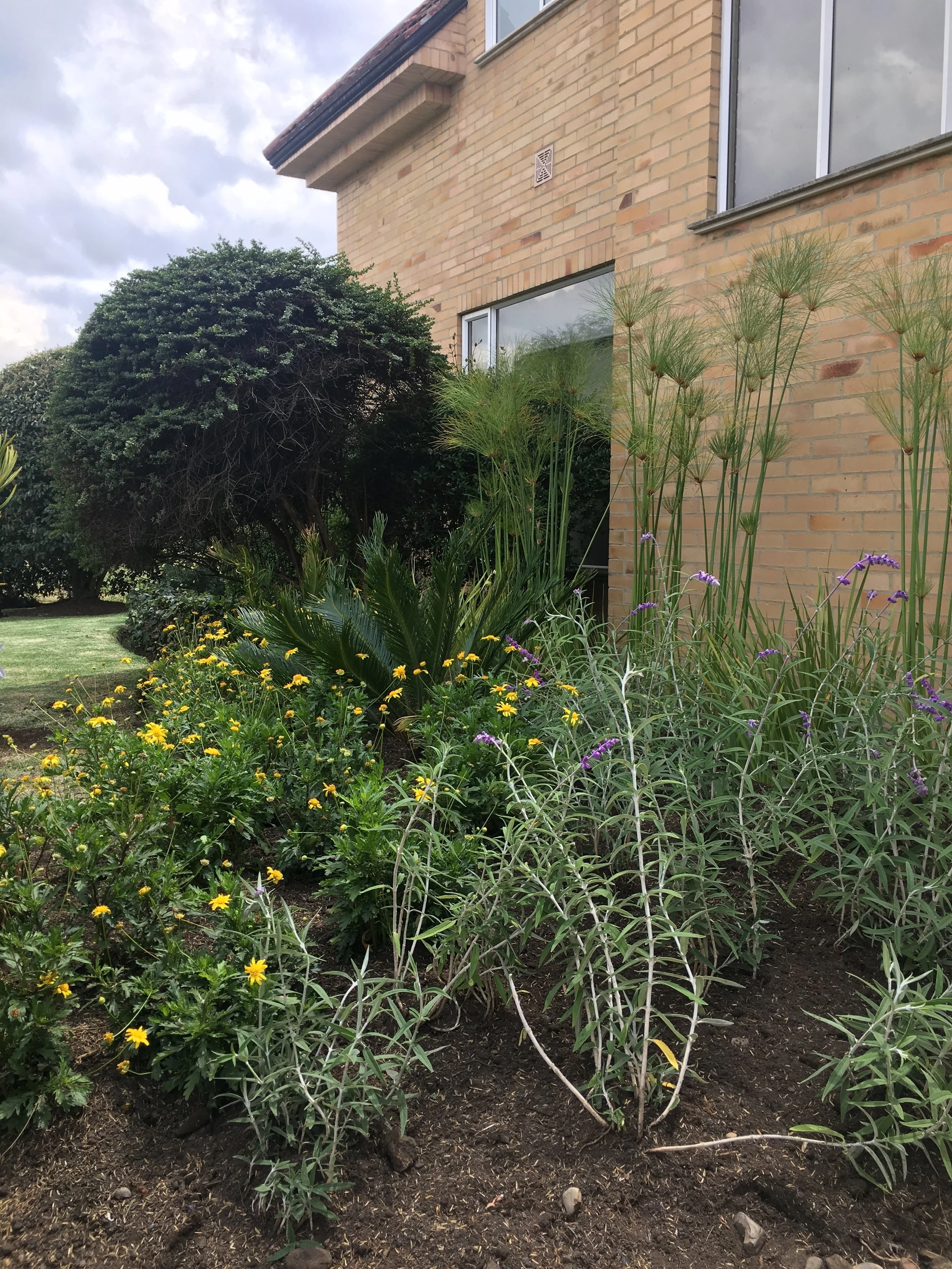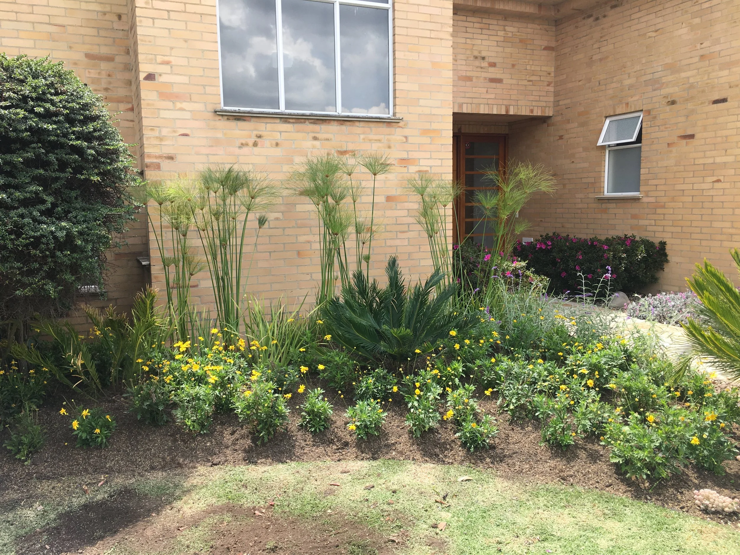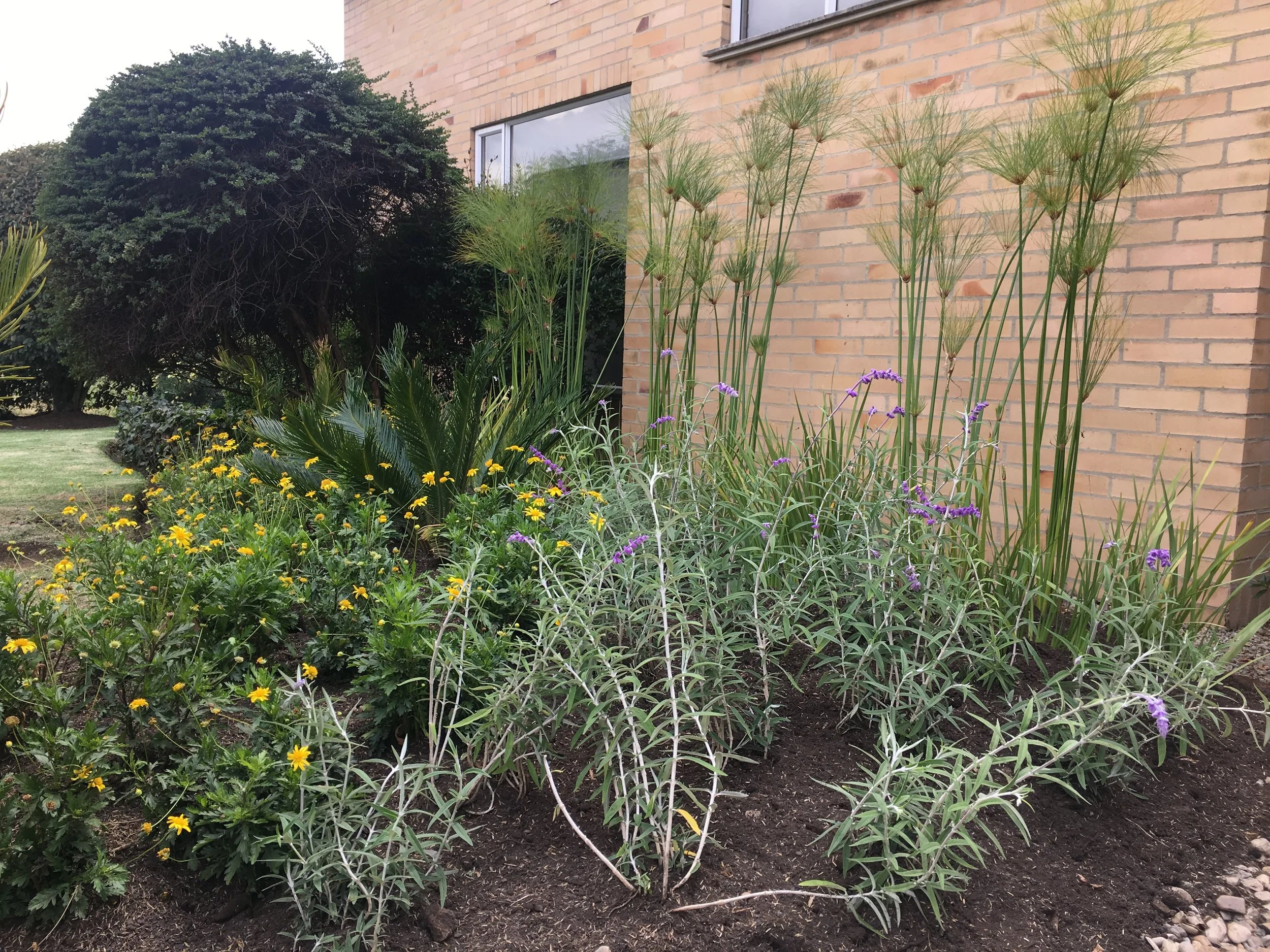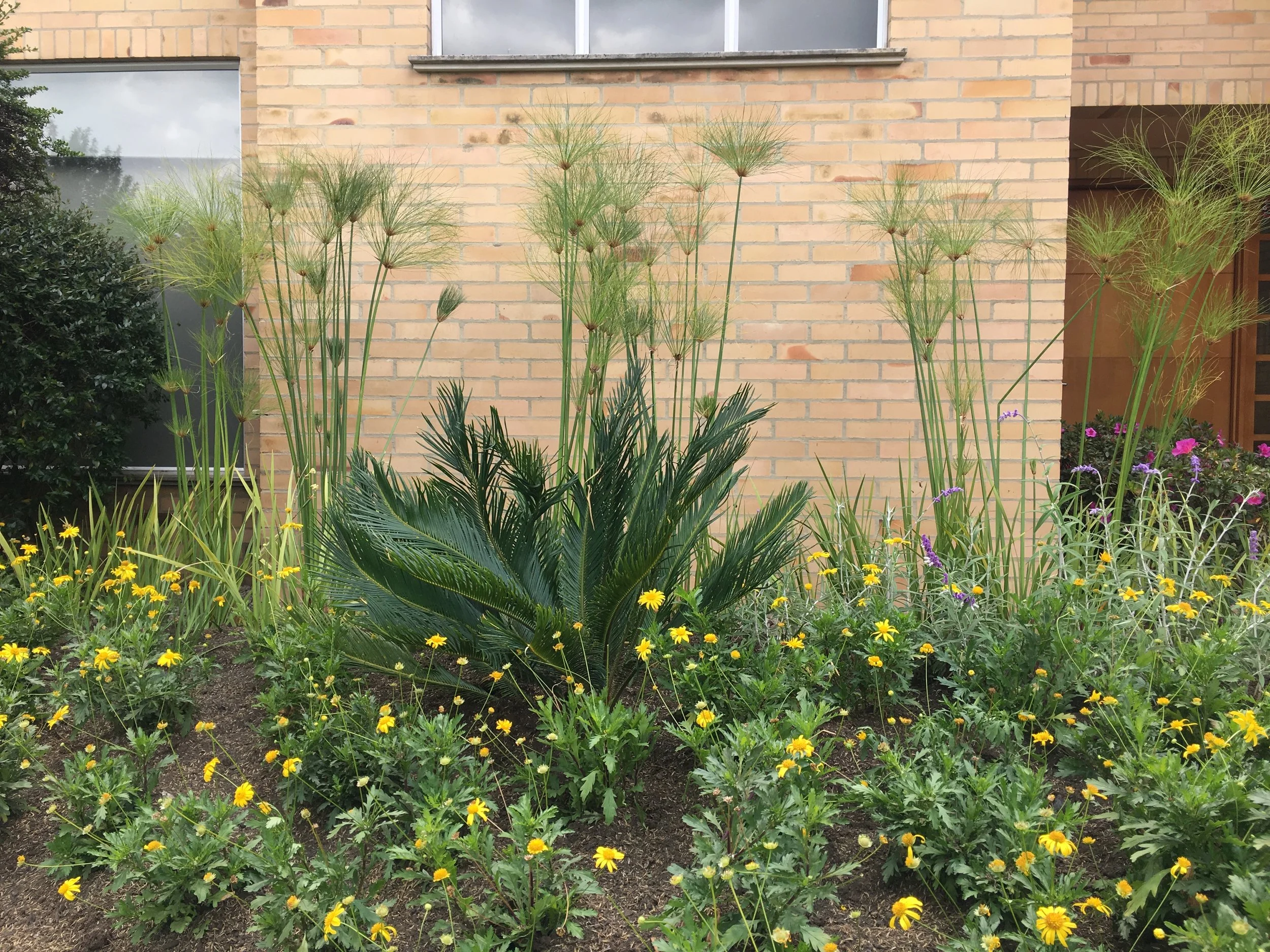 Características: Las margaritas amarillas, salvias y sedums se sembraron en este antejardín para alegrar la entrada de la casa. Los papiros proporcionan altura y cubren parte de la textura ladrillo.