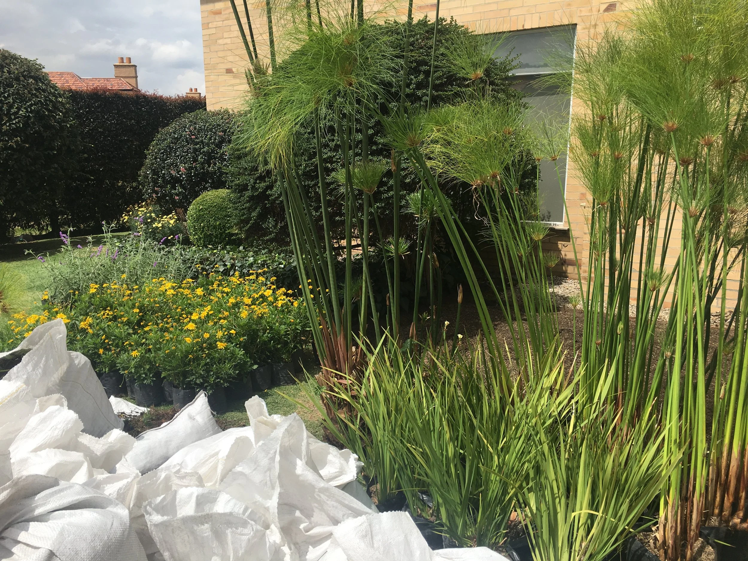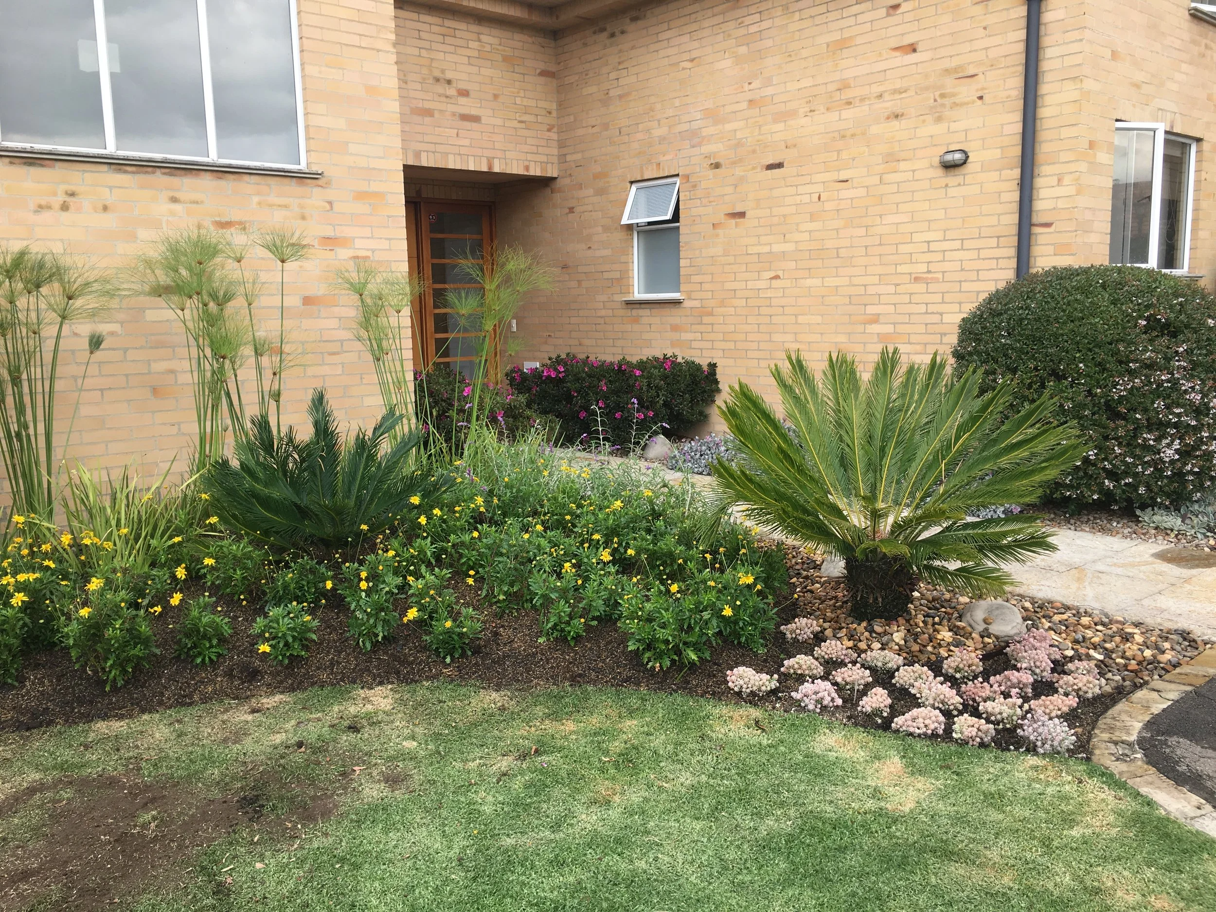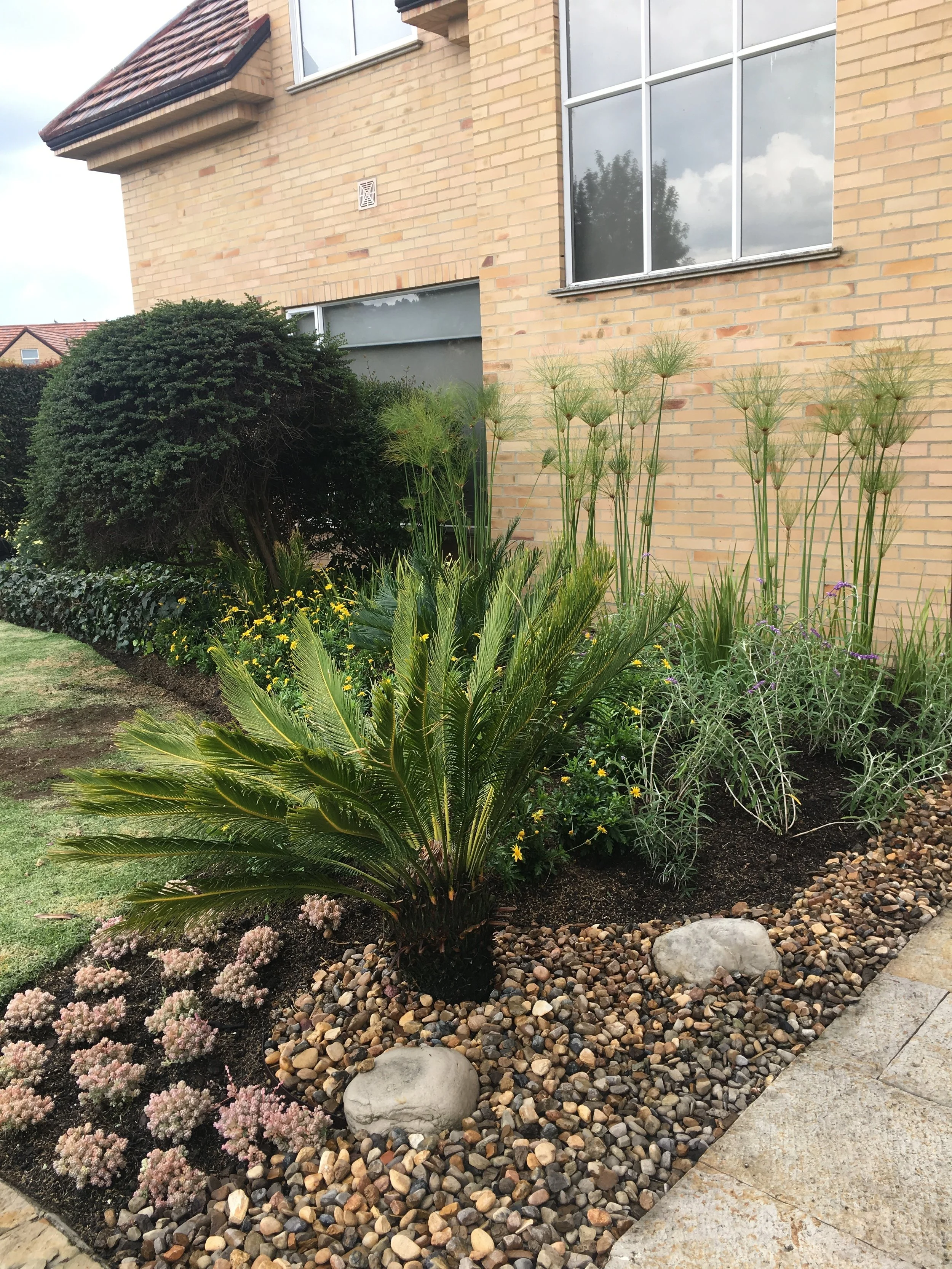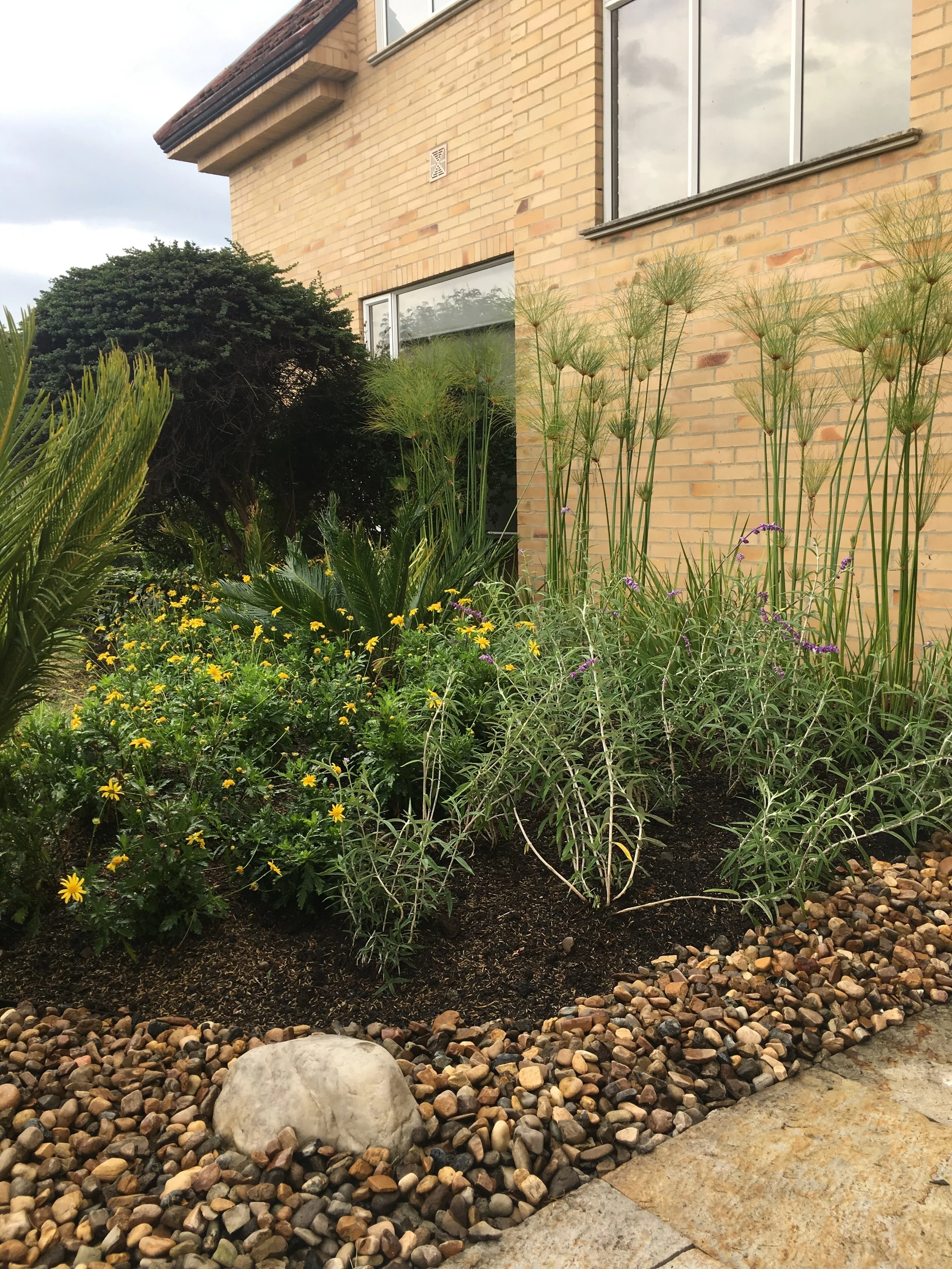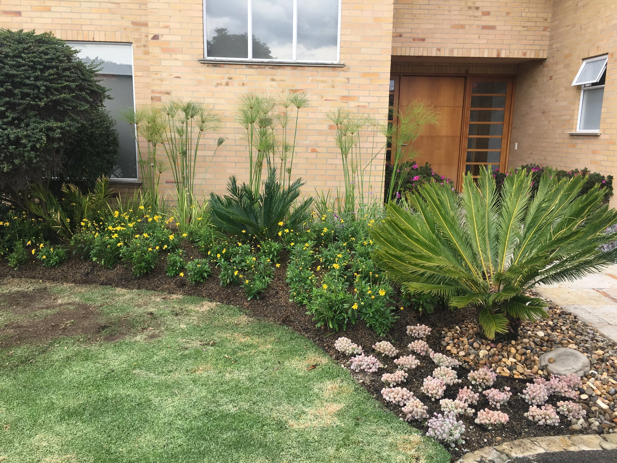 Características: Las margaritas amarillas, salvias y sedums se sembraron en este antejardín para alegrar la entrada de la casa. Los papiros proporcionan altura y cubren parte de la textura ladrillo.