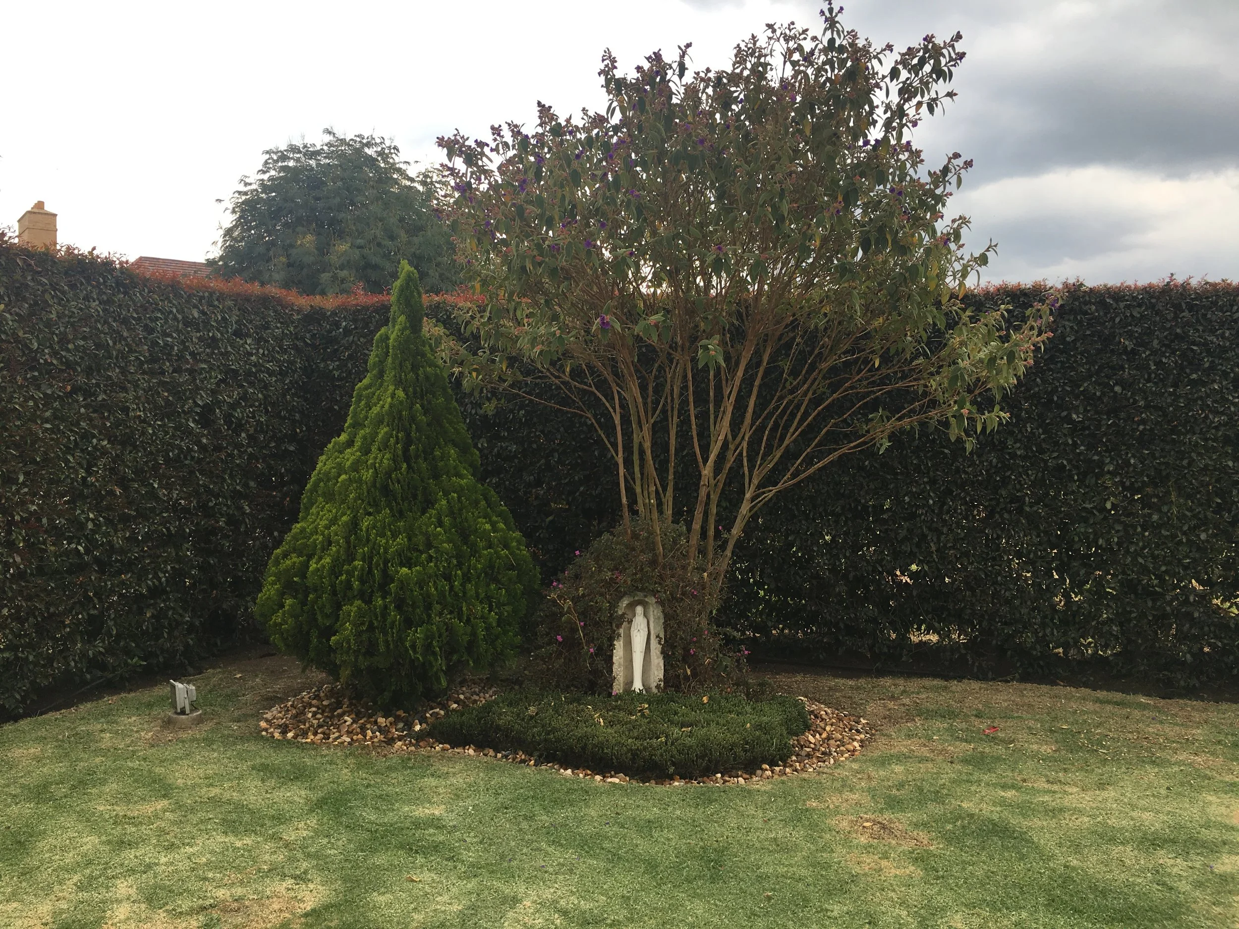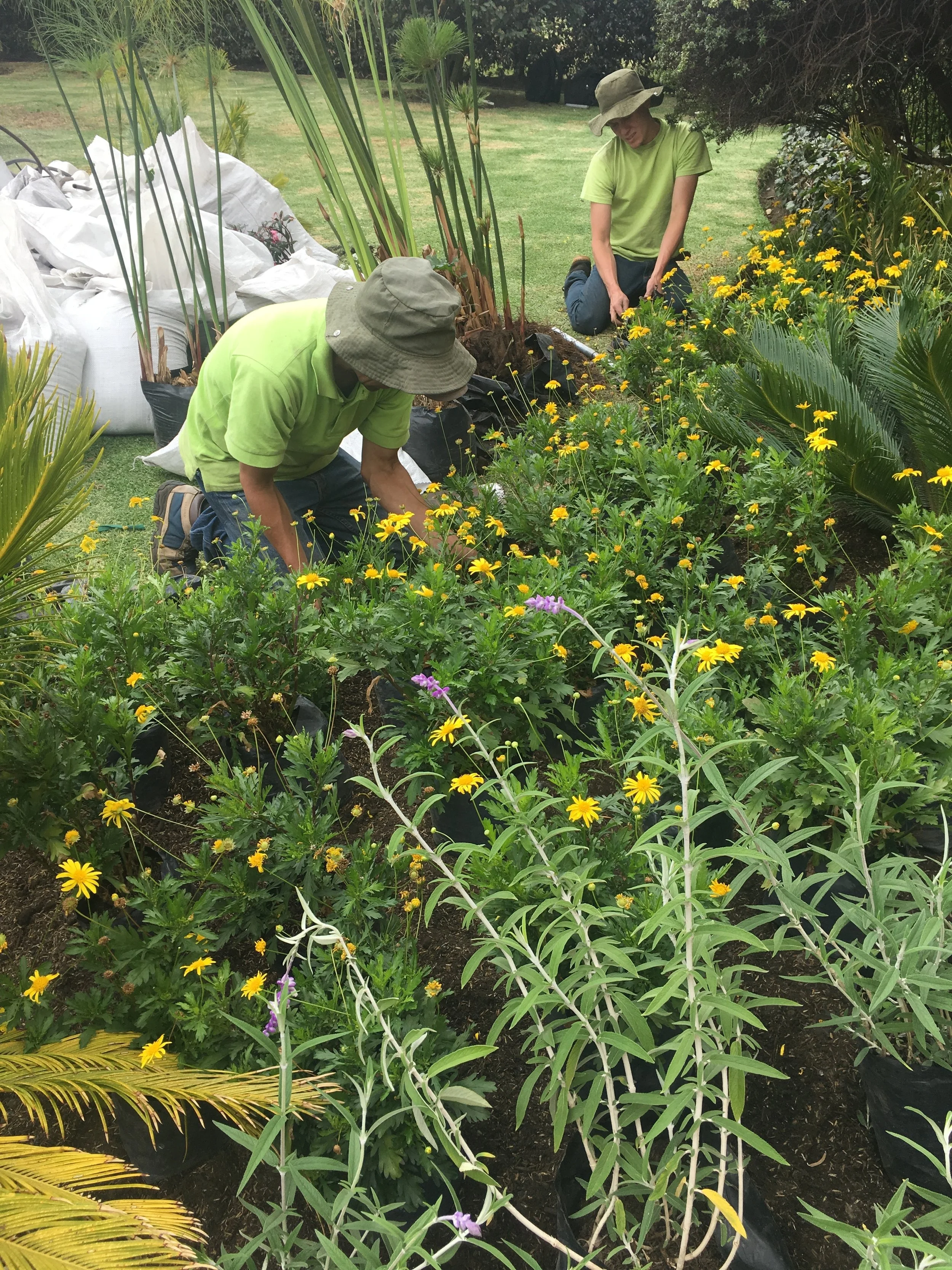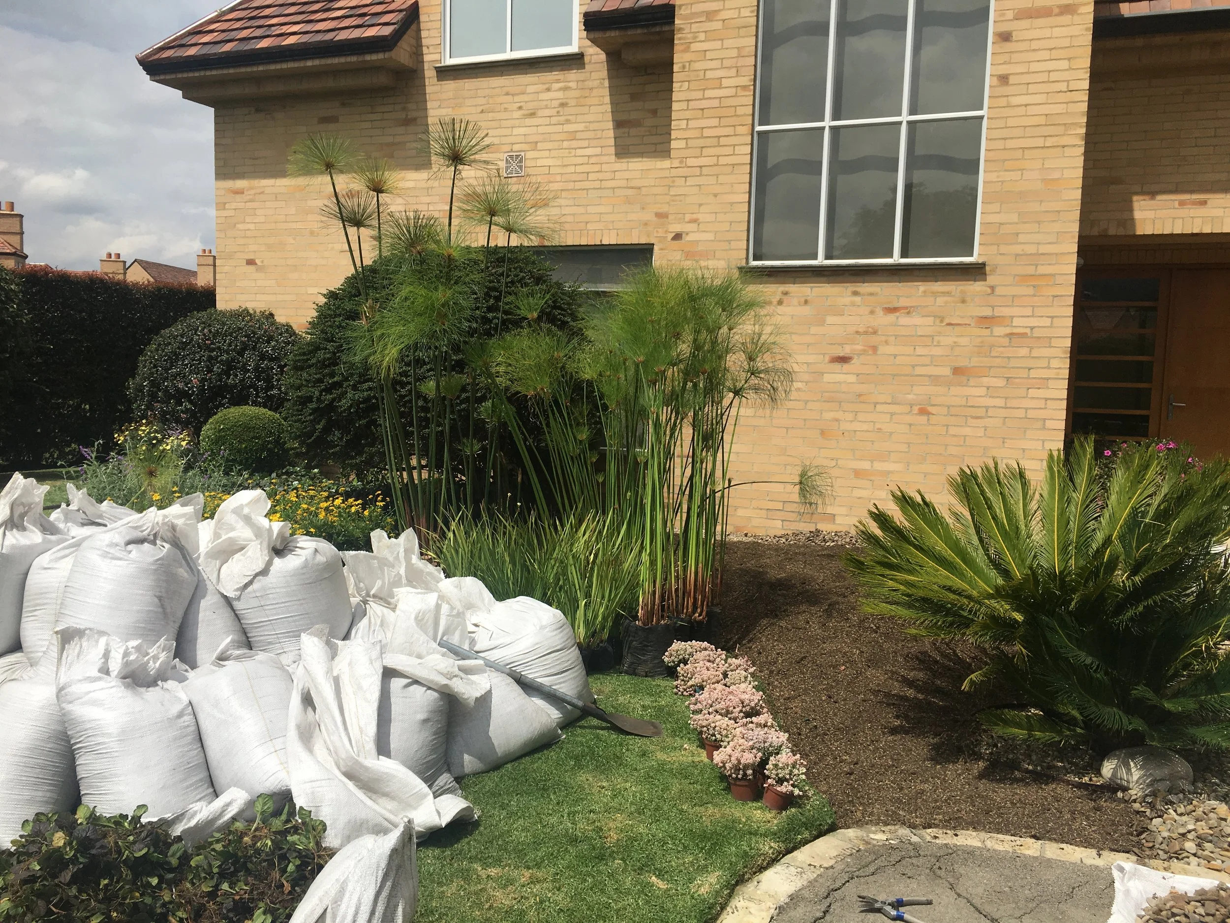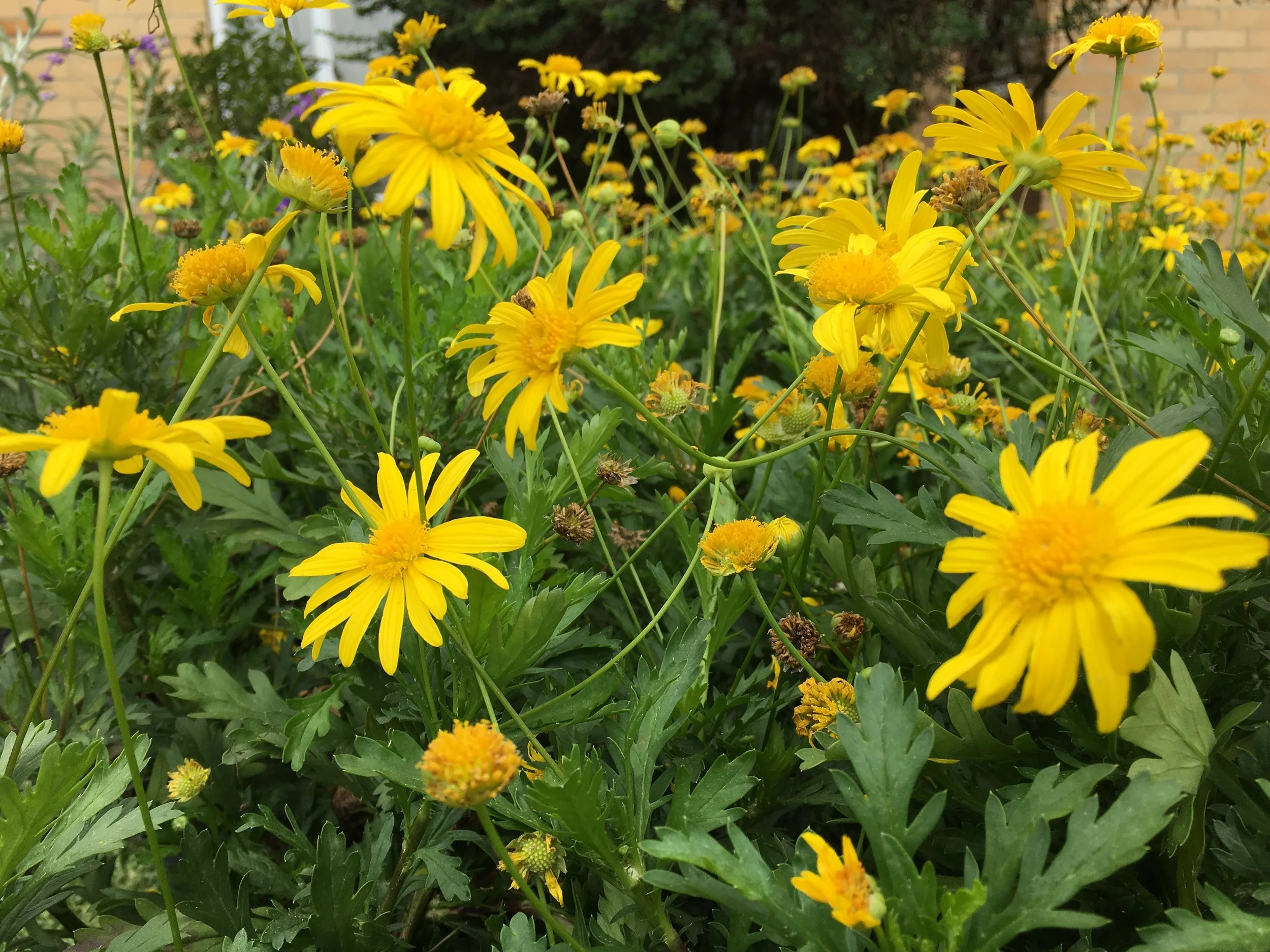 Características: Las margaritas amarillas, salvias y sedums se sembraron en este antejardín para alegrar la entrada de la casa. Los papiros proporcionan altura y cubren parte de la textura ladrillo.