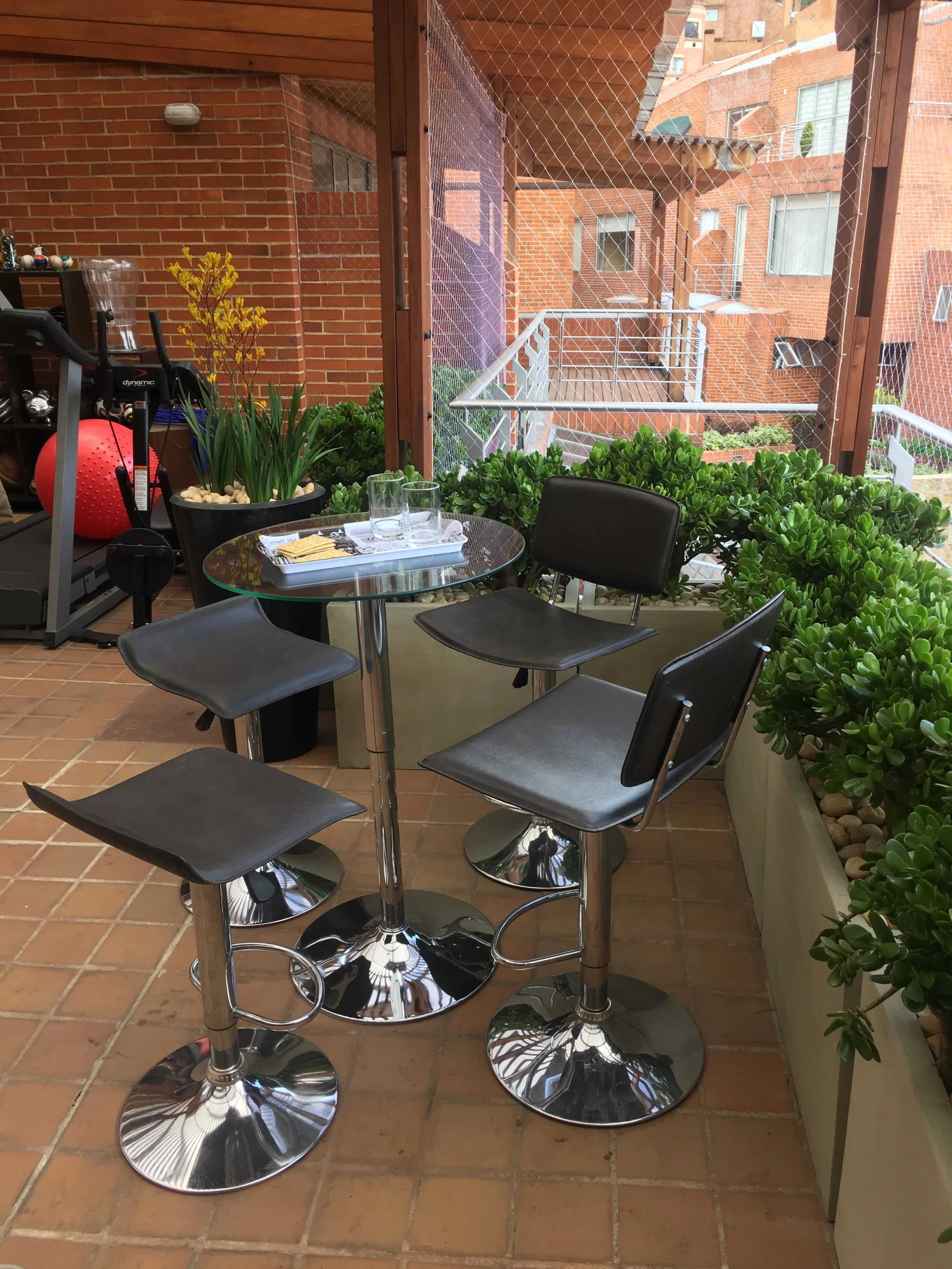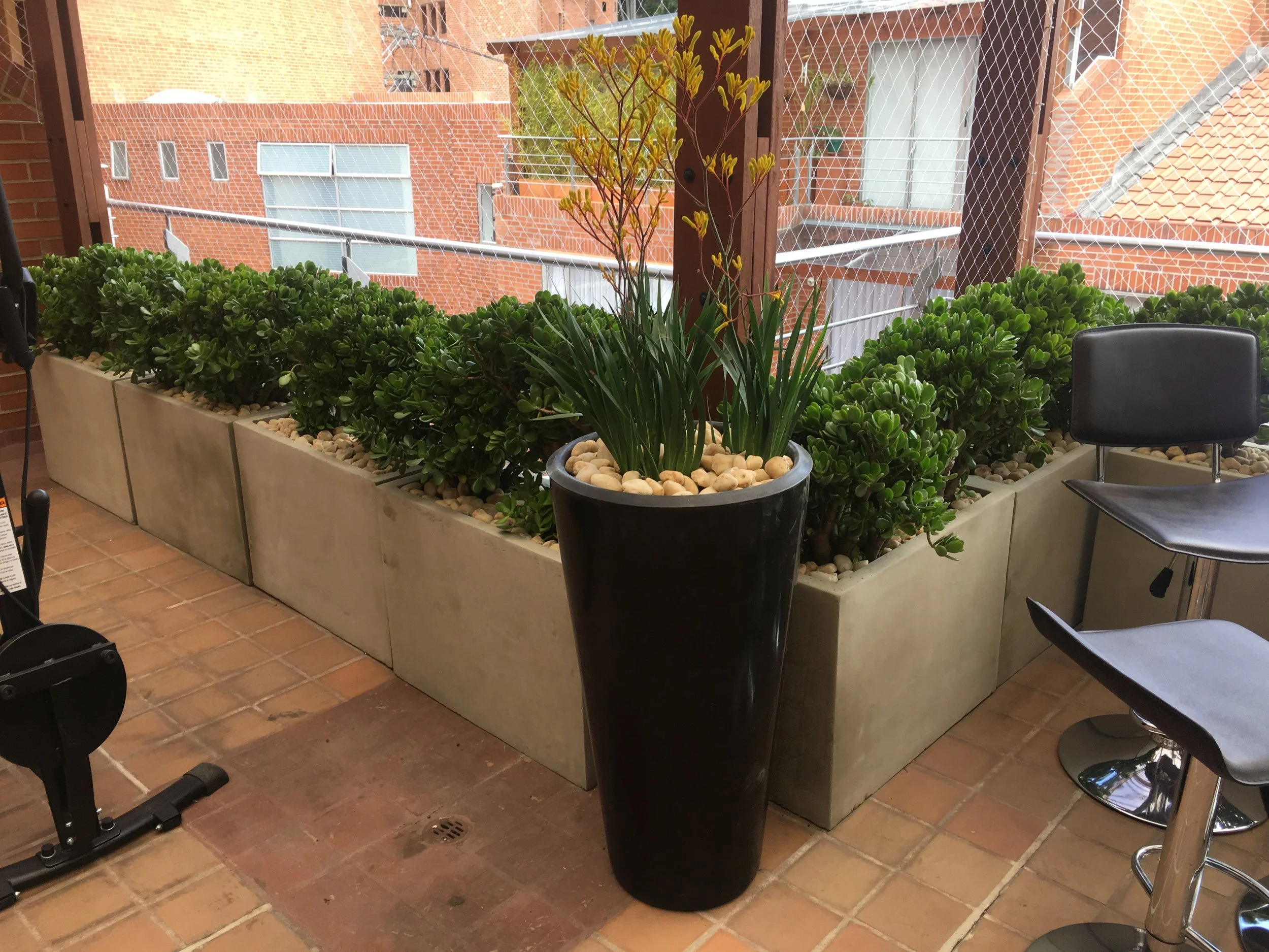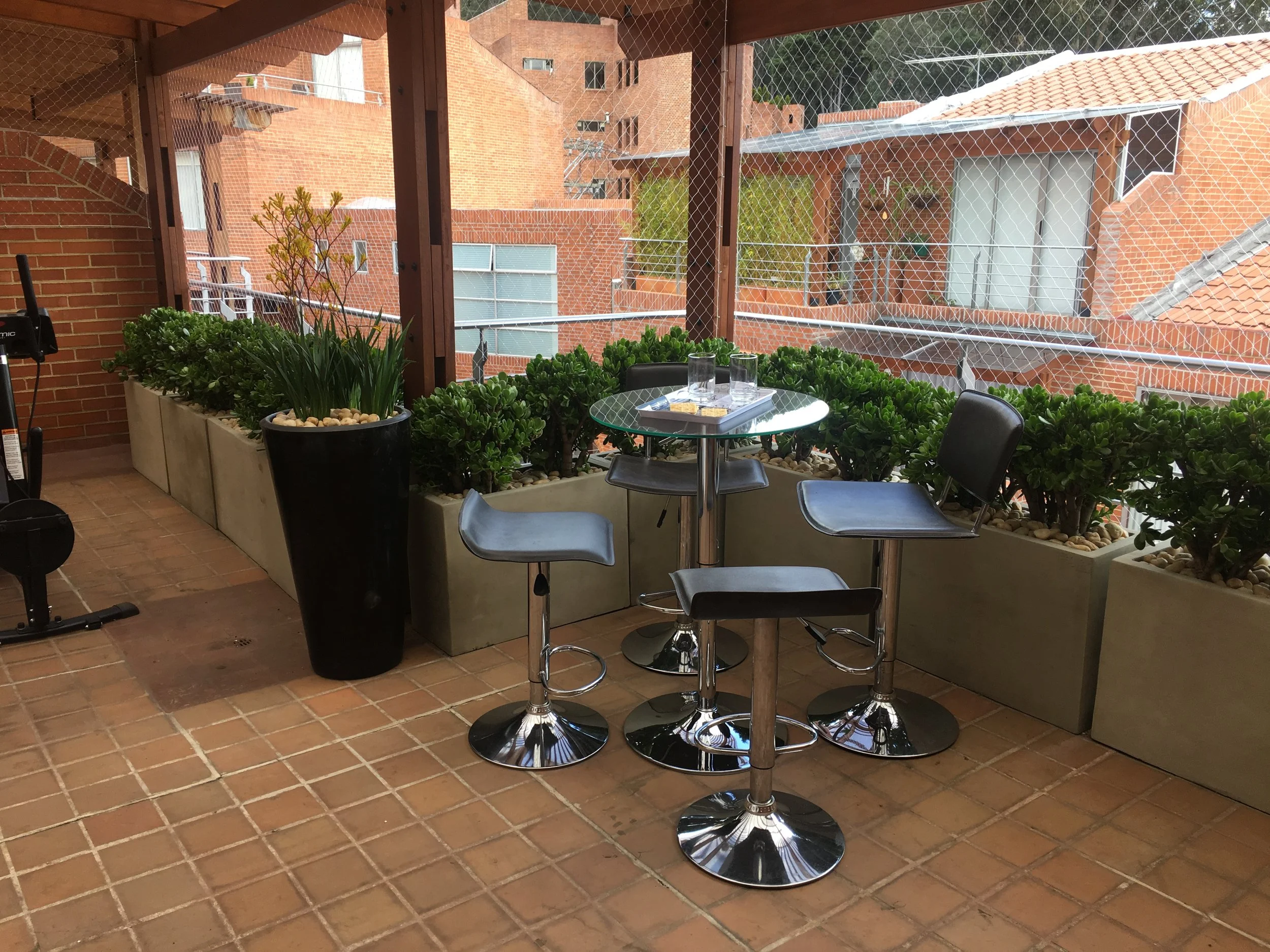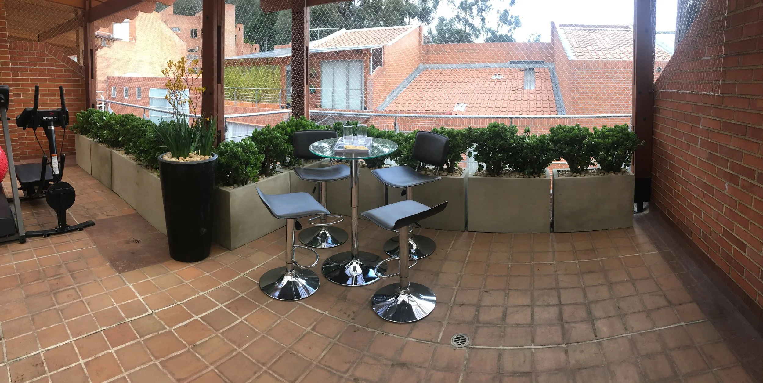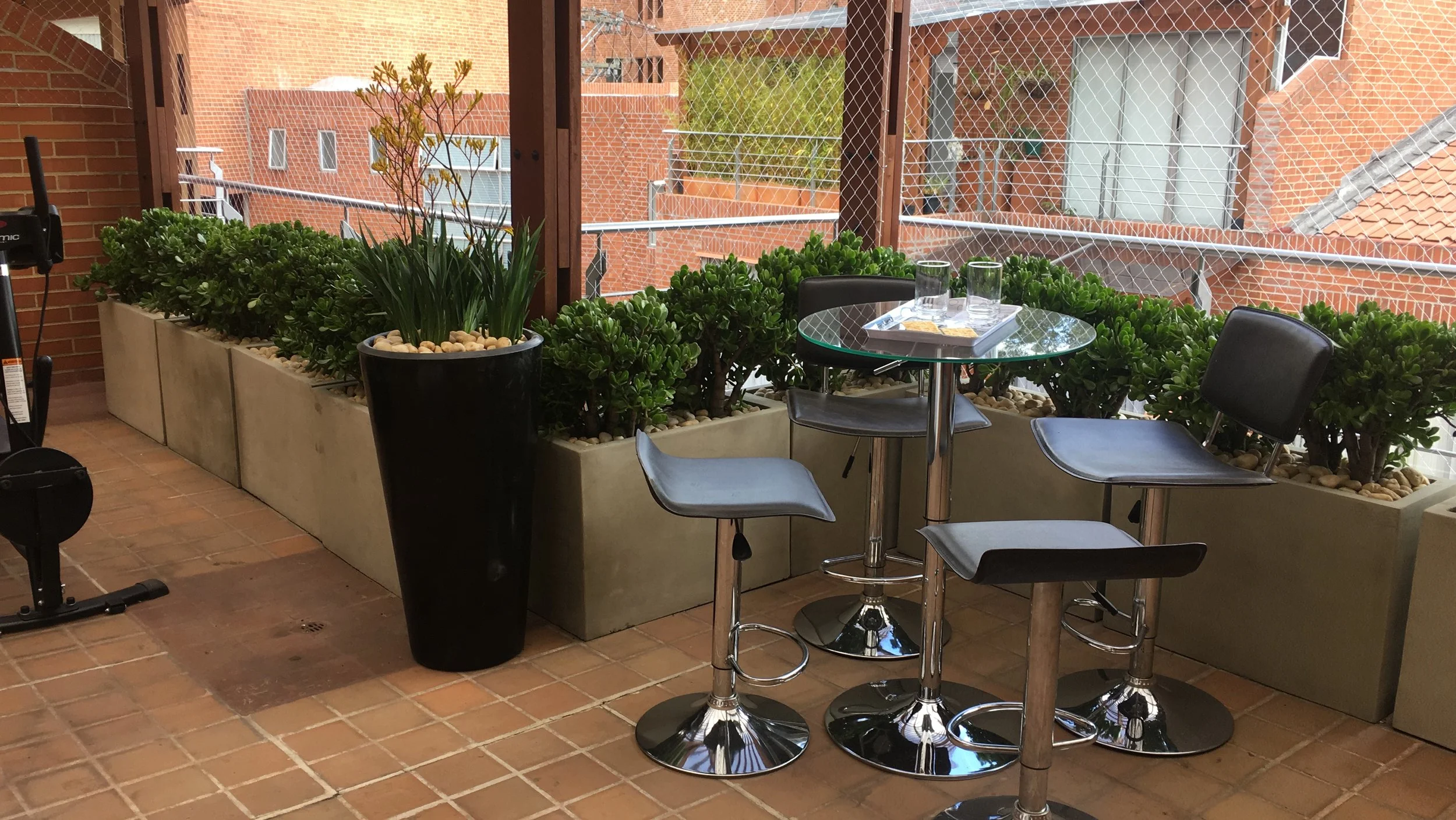 Características: Se ubicaron materas en cemento con un sustrato aligerado y plantas de mediano porte, para generar un ambiente más privado sin obstruir la luz natural y visual del espacio. Las plantas sembradas necesitan poco mantenimiento. Se diseñó pensando en contrastar el rojo del ladrillo con el verde intenso del Jade.