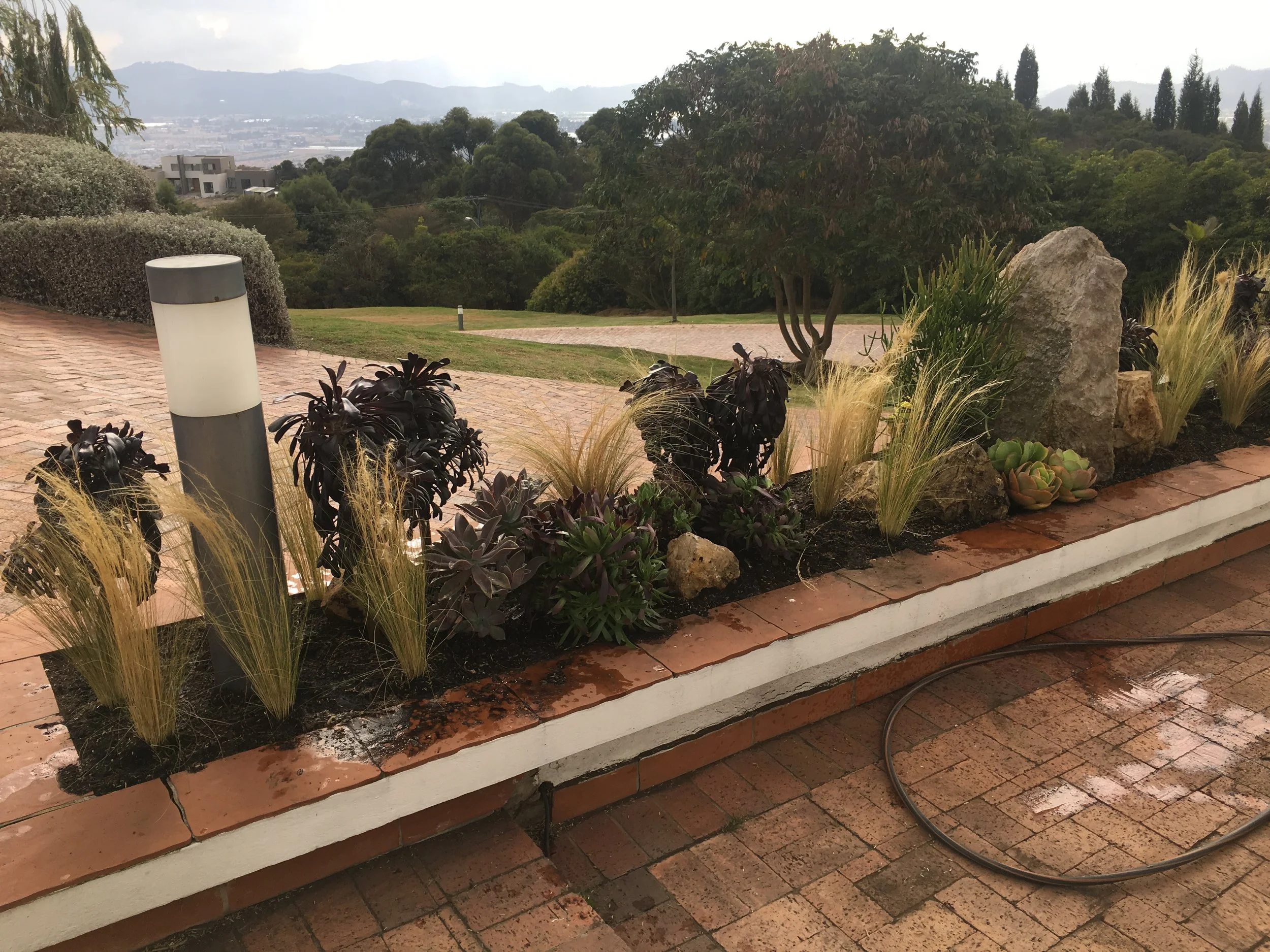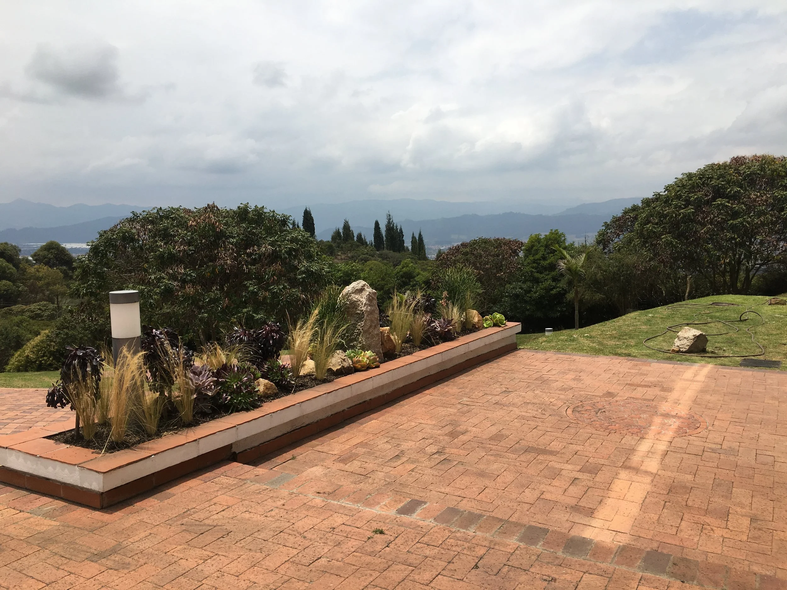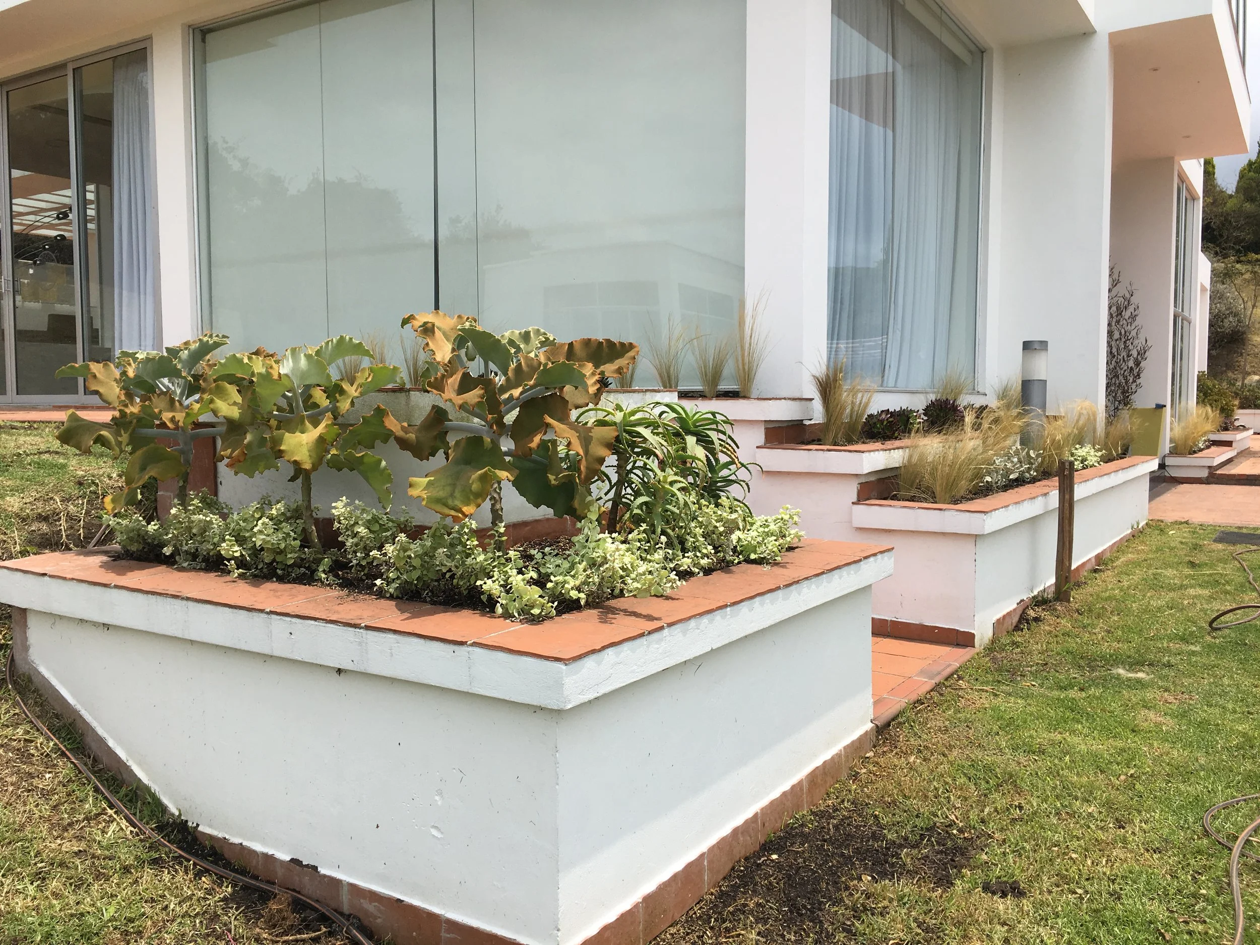 Características: Se sembró un jardín con crásulas y suculentas, sus duras texturas se contrastaron con la delicadeza de los pastos. Su juego con el viento le dan una sensación de calma y funden los límites con el paisaje. También, se implementaron dos materas verdes limón con hayuelos vinotintos para enmarcar y equilibrar la entrada a la imponente casa.